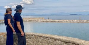 This led us towards the arrival of our next visitors, longstanding mates, RS and various other craft sailors, Giles and Heather, from Lymington. They’re not only winning sailors, they also know how to enjoy the fine things in life – and Giles loves nothing more than a good castle. Another pick-up from an anchorage off Pogonia via Nikos – a fortunate good weather week – a variety of sailing around the islands squeezed between breakfasts, coffees, dinners and ice creams ashore – an over-long walk and, in the nick of time, castles near Levkada and Preveza that made Giles’ trip. It was all fabulous. It’s great the way everyone brings a different character to their time aboard.